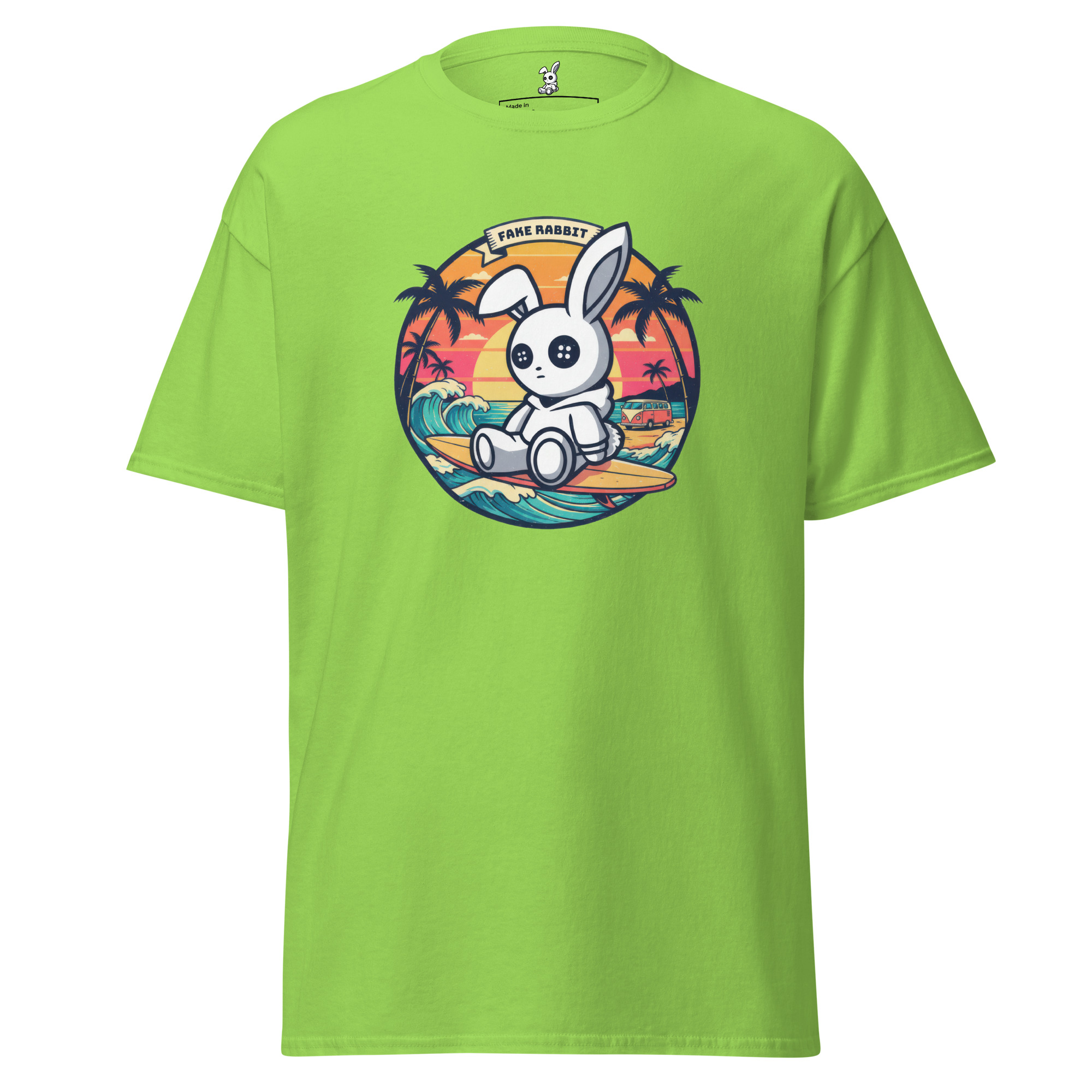 In diesem sommerlichen Design sitzt unser charakteristischer Hase lässig auf einem Surfbrett – vor einer leuchtenden Sunset-Kulisse mit Palmen, Ozeanwellen und warmen Retro-Farben.